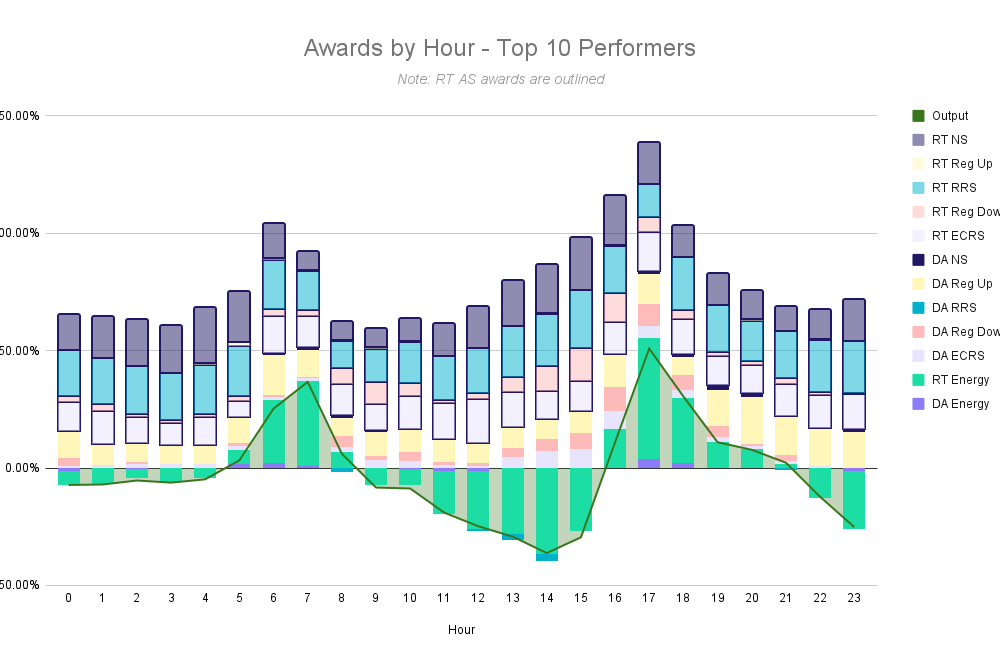 If we filter down to the top 10 performers (measured by % of DA TB2 captured), we see significantly more activity overall, with an average output ~17% vs 11%. Much of this incremental participation was in RT energy (16.8% for top performers vs. 11% for the full fleet), which signifies more willingness to cycle / discharge even if prices weren’t sky high.